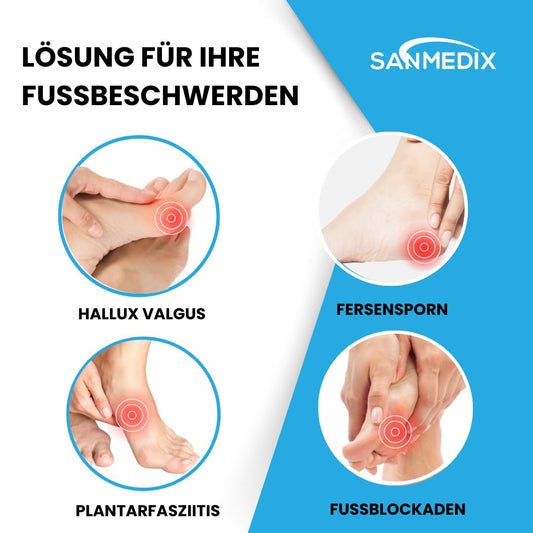 Leidest du unter Hallux Valgus (Ballenzeh)? Mit dem Sanmedix Hallux Care Set kannst du deine Füße sanft zuhause entlasten, Schmerzen lindern und wieder leichter gehen – ganz ohne OP.